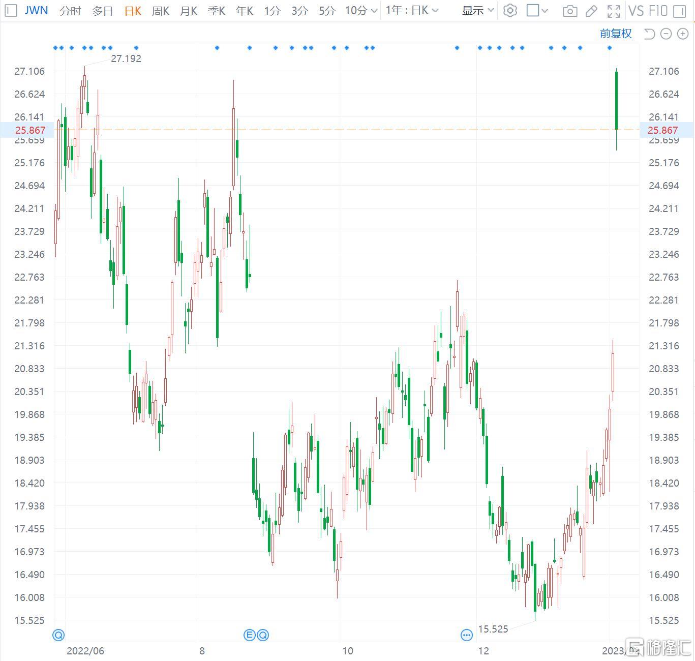 格隆汇2月3日丨诺德斯特龙涨22.18%,报25.829美元,总市值41亿美元,股价盘中涨28%,创近8个月新高。据市场消息, “知名激进投资者”Ryan Cohen正在增持诺德斯特龙的大量股份,并在股价下跌后敦促这家百货连锁公司对董事会进行调整。William Blair分析师Dylan Carden仍维持诺德斯特龙(JWN.US)“与大盘持平”评级,此前有消息称“知名激进投资者”Ryan Cohen正在增持诺德斯特龙的大量股份。Carden表示,诺德斯特龙家族控制的30%股份对Cohen来说将是一个障碍,但补充道,Cohen在推动变革方面有着历史性的表现。