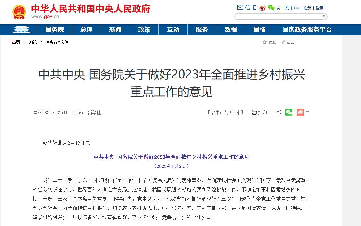 2月13日,《中共中央 国务院关于做好2023年全面推进乡村振兴重点工作的意见》(以下简称“《意见》”)发布。《意见》指出,必须坚持不懈把解决好“三农”问题作为全党工作重中之重,举全党全社会之力全面推进乡村振兴,加快农业农村现代化。