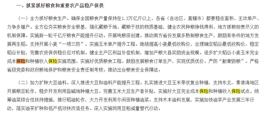 同时,在《意见》中共提及6次“保险”,分别涉及粮食和重要农产品(000061)稳产保供、强化政策保障和体制机制创新等方面。