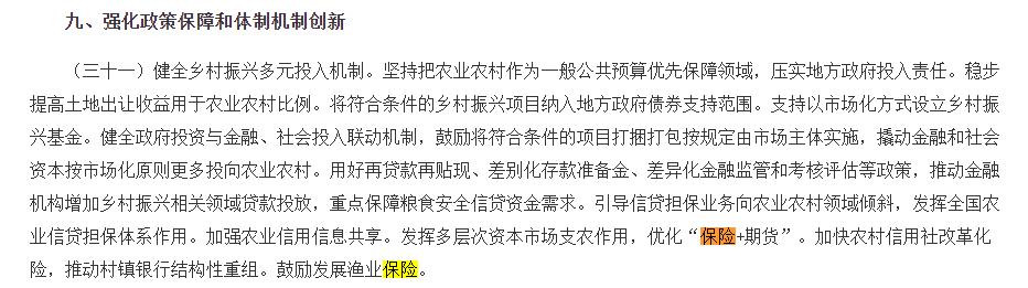 在强化政策保障和体制机制创新方面,《意见》提到,要健全乡村振兴多元投入机制。坚持把农业农村作为一般公共预算优先保障领域,压实地方政府投入责任。稳步提高土地出让收益用于农业农村比例。引导信贷担保业务向农业农村领域倾斜,发挥全国农业信贷担保体系作用。加强农业信用信息共享。发挥多层次资本市场支农作用,优化“保险+期货”。鼓励发展渔业保险。